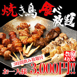朝引き地鶏の炭火焼鳥が食べ放題など全8品+3h飲み放題付